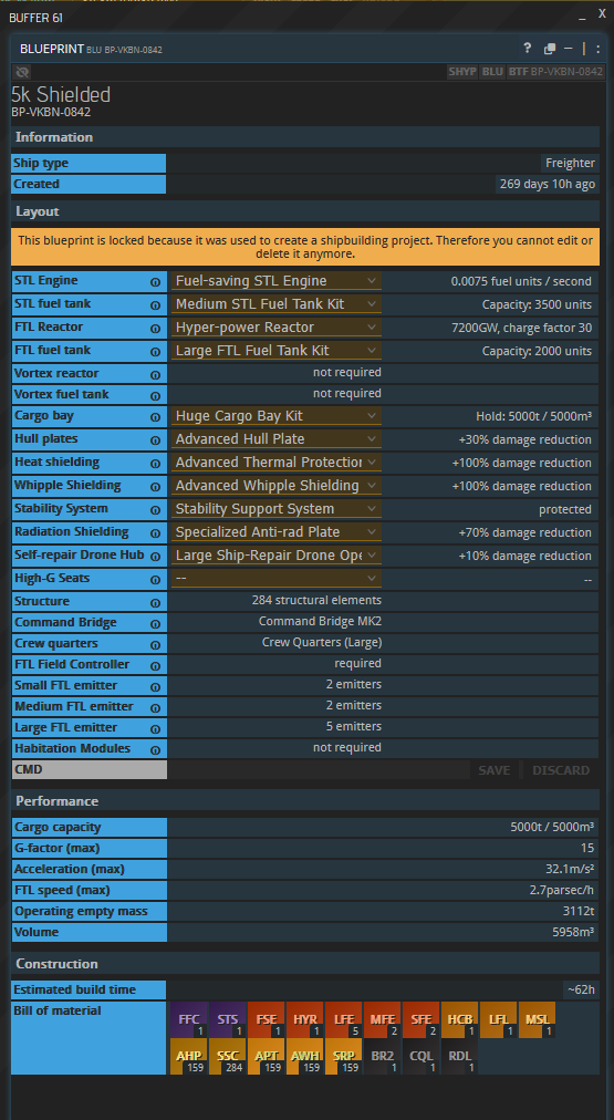 Create a ship blueprint that matches the above image. Rent 4 warehouses on Hephaestus to store the entire ship, or insert components into the ship as you accept the contracts. Make sure to click “start” in the shipyard after adding all the components.